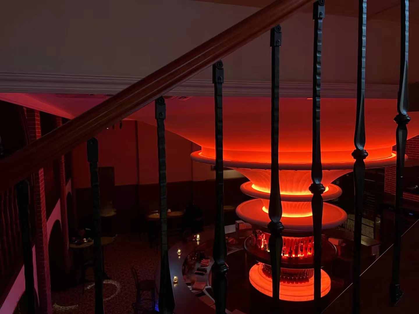 For the rest of the space, we used a combination of track lights and candles to provide general illumination and highlight guests' faces. We also added decorative wall sconces and picture lights to the lounge areas to draw attention to art pieces and create a visually appealing atmosphere.