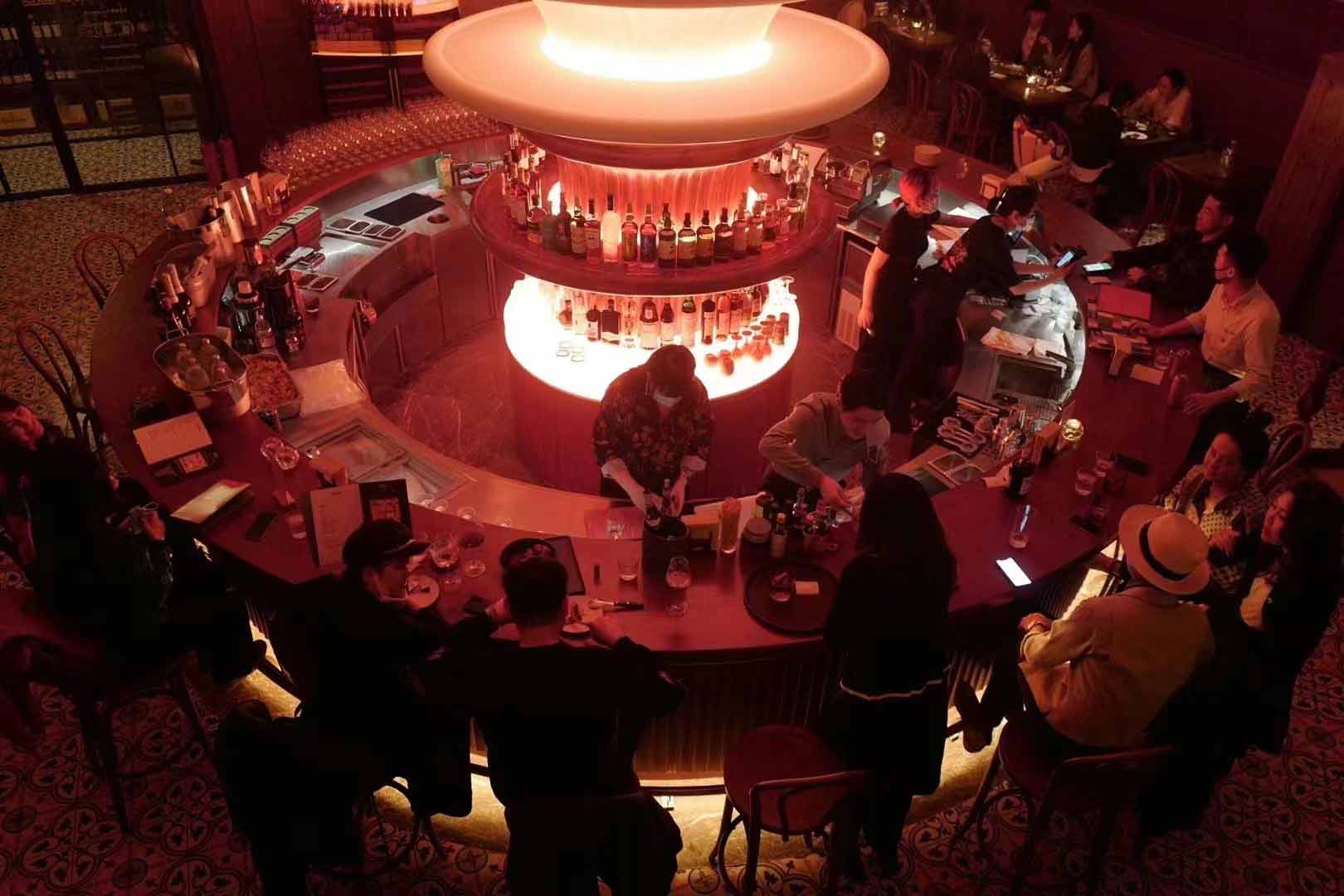 As a showstopper, a classical-style island serves as a focal point of the space, taking inspiration from the elements of the Brussels Palace of Justice from 1866. This representative Belgian building emphasizes the elegance of symmetry, arches, courtyards, and stone pillars, highlighting the importance that history has in inspiring continued innovation. Lighting was designed to create various colorful scenes—at times like a sunset, other times like a flame, and sometimes as deep as the ocean with a calming blue hue. On the stacked islands, color-changing linear lights at the bottom of each layer were installed to bring out its defining features, creating a captivating atmosphere that could reach its climax with carefully implemented lighting treatments.
