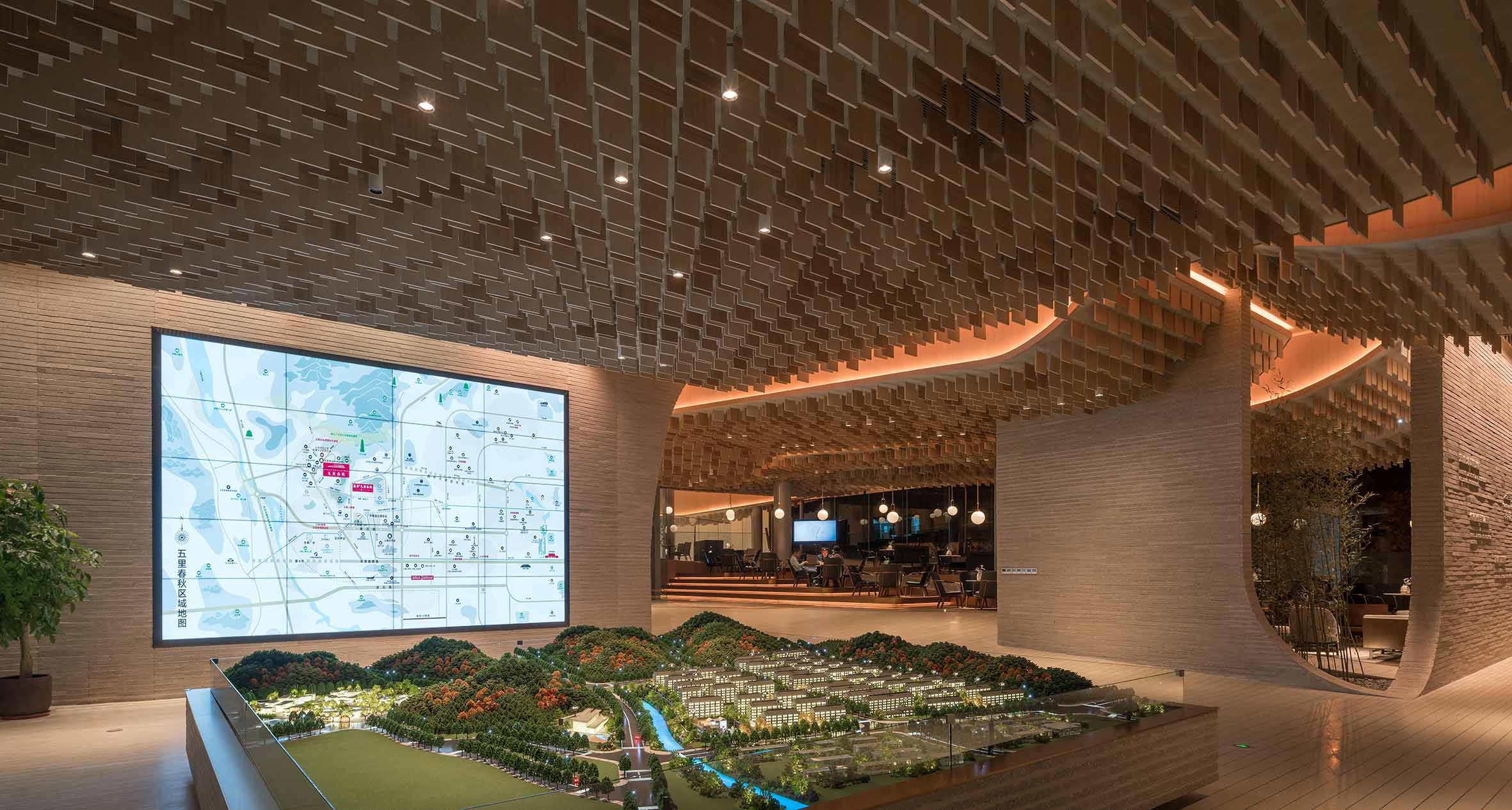 The architect uses a large area of natural wood color vertical sheet sequence to create a wavy curved surface as the top visual element of the interior space. The surface is supplemented by five grooves with a width of 40 cm to distinguish the boundary. For the facade of the grooves, warm-colored linear lights are selected and concealed to provide uniform lighting. The undulating bands of warm lights not only express the orderly but naturally undulating wooden vertical slices in an inverted mountain form at the top of the room.